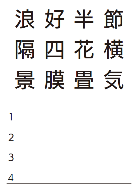 下記の文字をそれぞれ1度だけ使用して、三字熟語を四つ完成させよう
