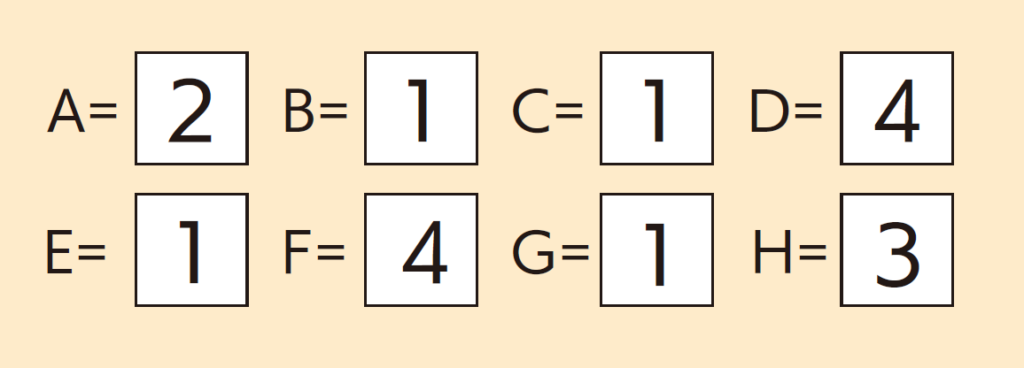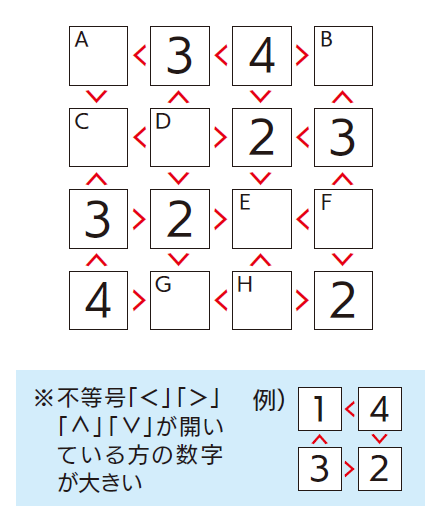 縦・横の各列に同じ数字が入らないように、枠に1~4の数字を不等号に従って入れよう