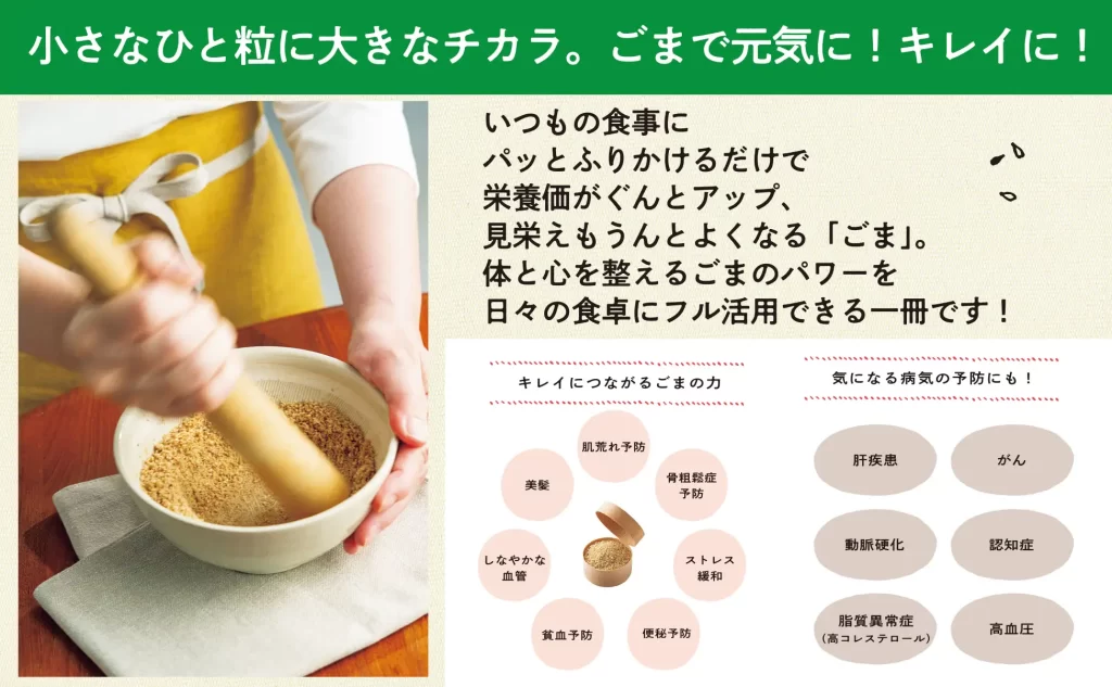 本書では、多くの人が、「なんとなく体によさそう」と思っていたごまの栄養と働きについてもわかりやすく解説。さらに、世界各国のごま文化や、種類別の特長、Q&Aなど、読むだけでごま博士になれる豆知識も紹介しています。