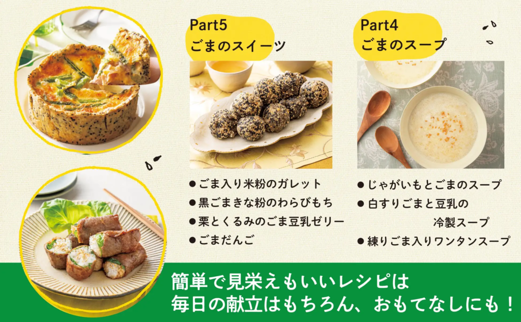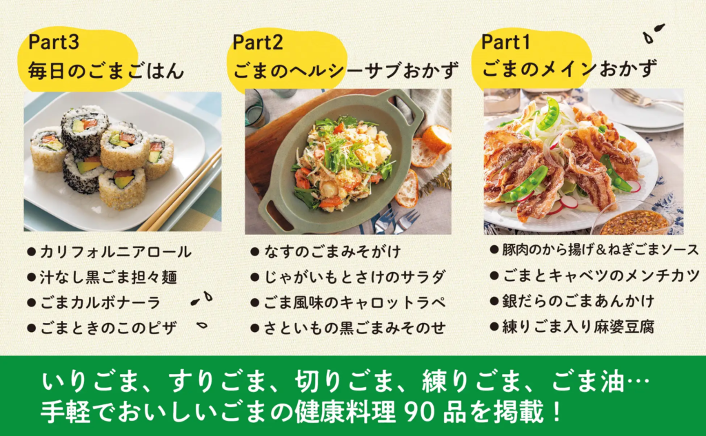 本書には、ごまのコクと香りを活かした「たれ・ソース・ドレッシング」や「万能調味料」、「栄養満点ごまふりかけ」などのレシピも収録されています!