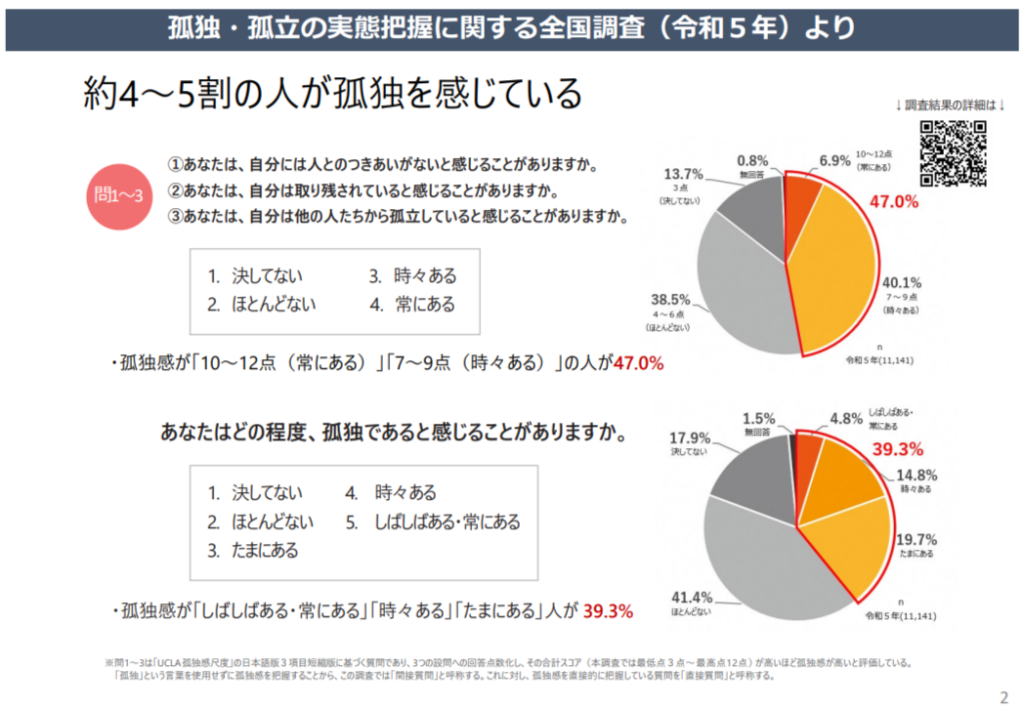 内閣府孤独・孤立対策推進室が令和5年(2023年)に行った調査によると約4~5割の人が「孤独を感じている」と回答しています。