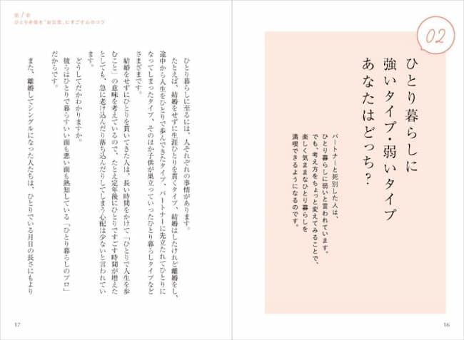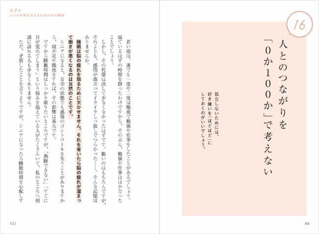 また、「長時間の睡眠は死のリスクを高める」といった最新の知見や、「人とのつながりを『0か100か』で考えない」といった高齢期特有の人間関係の距離の取り方、「『死の恐怖』と向き合うイメージトレーニング」など、ひとりでなくても老後に誰もが気になるさまざまな問題についても、専門医の視点でわかりやすく解説しています。