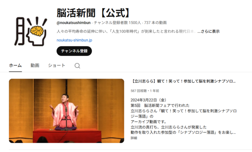 脳トレ問題を週2~3本配信しているほか、脳活新聞フェアの際に披露された立川志らら氏の落語の様子や、スロージョギング動画などを公開しています!