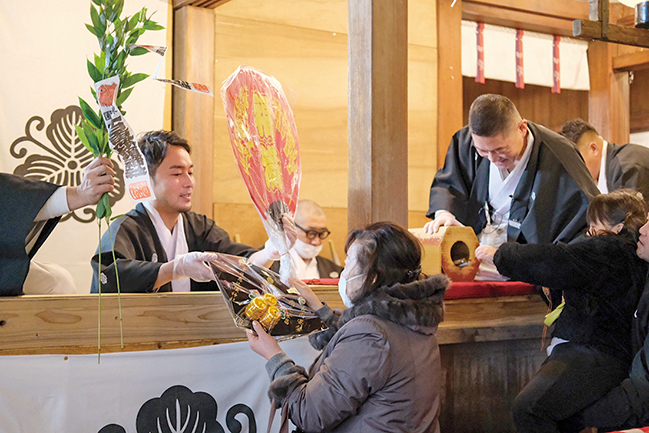 挑戦したいのが、空くじなしの福引。「大当たりー!」と威勢のいい声が響き、福笹とともに福起こし(だるま)や金扇など縁起物が授与される。参加者多数の場合は早期終了するため大祭初日が最もにぎわう。