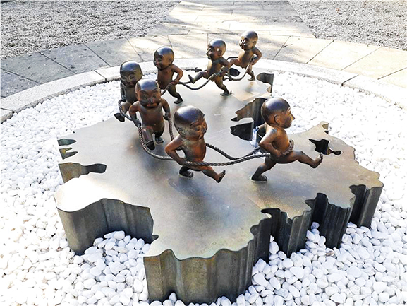 鳥居前のオブジェ「縁結び七福童子」。九州各県を結ぶ7人の子どもが電車ごっこをしている
