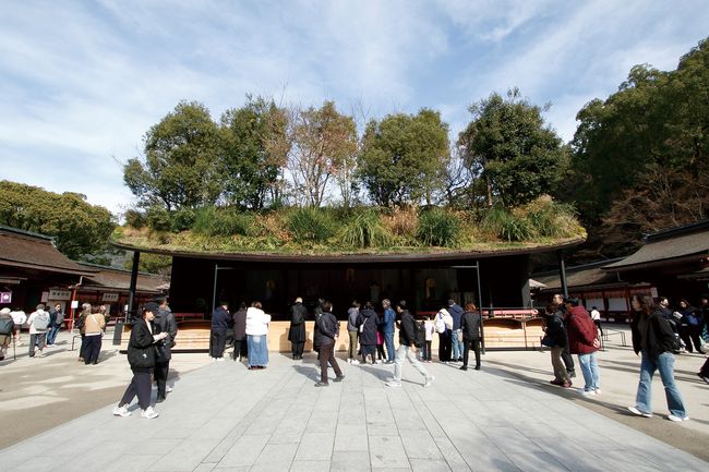 改修期間は23年5月から約3年に及び、その間は屋根の上に木々を配し森が浮かぶように見える「仮殿」で多くの参拝者を迎えています。建築家の藤本壮介氏が道真公にまつわる「飛梅伝説」に着想を得てデザイン・設計し、自然と調和した穏やかなたたずまいを醸しています。