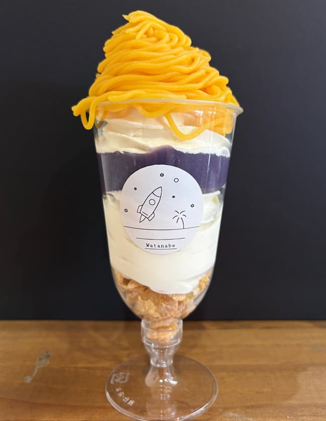 パフェの中の紫芋は、甘味が強く希少な品種「種子島ゴールド」を使用。その上にねっとり甘い安納芋のペーストがたっぷり。