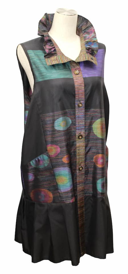 工房TOKARAでは、それを再解釈した「トカラ織り」で生地を織り、洋服をデザインしています。柄・色合いを現代風にアレンジして、華やかな衿フリルもファッショナブルで魅力的です。