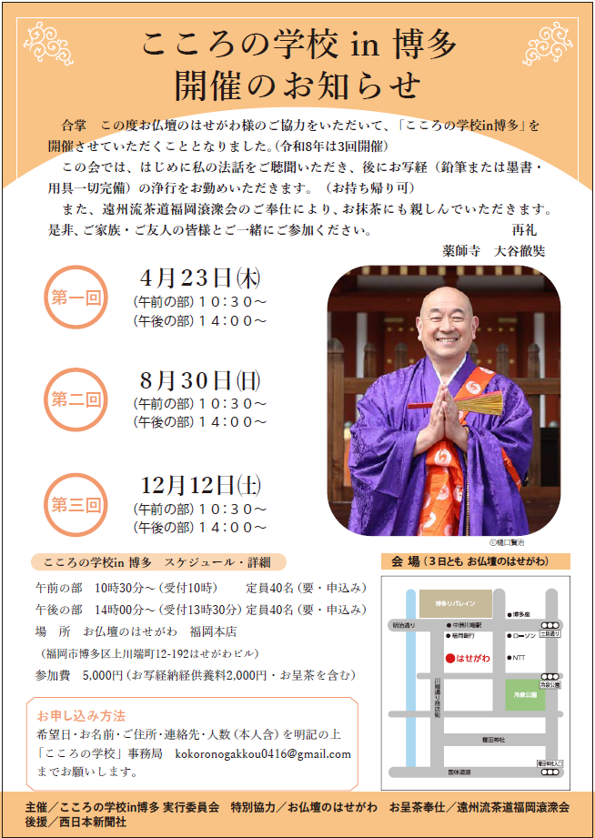 「こころの学校」は心の整え方や前向きに行動するヒントについて、大谷さんが全国で行っている市民向けの法話で、福岡では初開催。4月23日(木)、8月30日(日)、12月12日(土)のそれぞれ午前10時半からと、午後2時からの計6回実施されます。会場はいずれも「お仏壇のはせがわ 福岡本店」(福岡市博多区上川端町)。参加費は各回5千円(写経の納経供養料2千円を含む)で、1回のみの受講も可能です。定員は各回40人(先着順、要事前申込)。