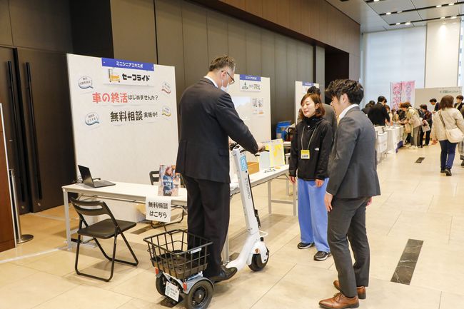 今回初の試みで「ミニシニアエキスポ」ブースを展開しました。安全機能が付いたリンナイのガスコンロ、免許返納後の移動を楽しくするセーフライドの立ち乗りシニアカーなど多彩なラインアップに多くの人が足を止め、体験したり、熱心に質問したりしていました。