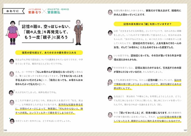 認知症の方への介護経験があり、介護福祉士の国家資格をもつ「メイプル超合金」の安藤なつさんが、対話形式でナビゲートする認知症の超入門書。教えてくれるのは認知症界の最高権威で医師の繁田雅弘さん。認知症は誤解の多い病気で、家族間のすれ違いを生んでいます。親を知り、自分を守り、健やかな親子関係を取り戻す、最もやさしい認知症の手引書です。