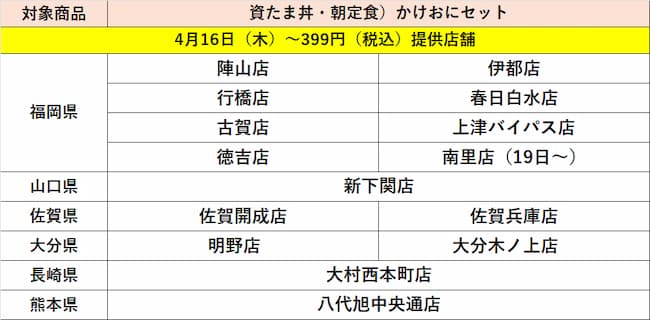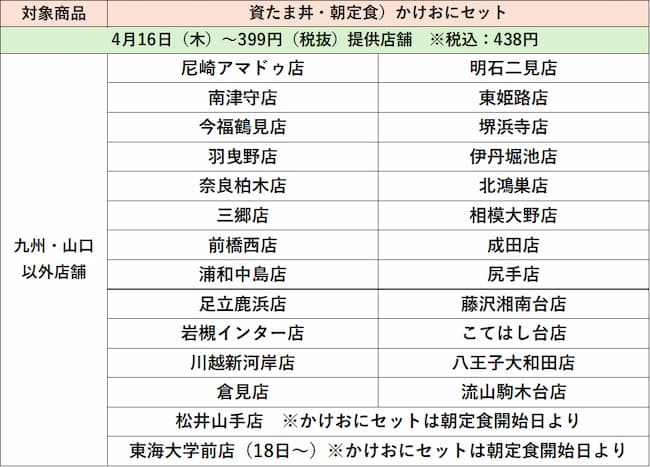 「資たま丼」「かけおに(※朝限定)」実施店舗一覧