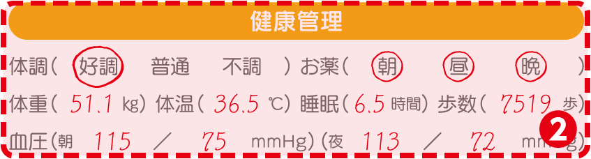 体調・お薬・体重・体温・昨晩の睡眠時間・
