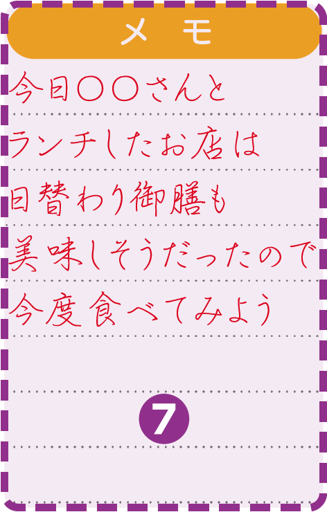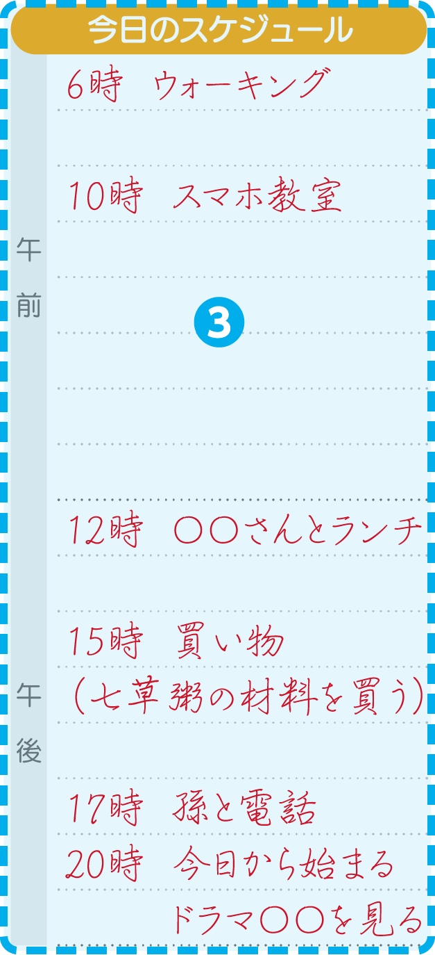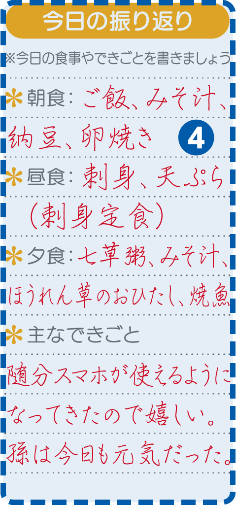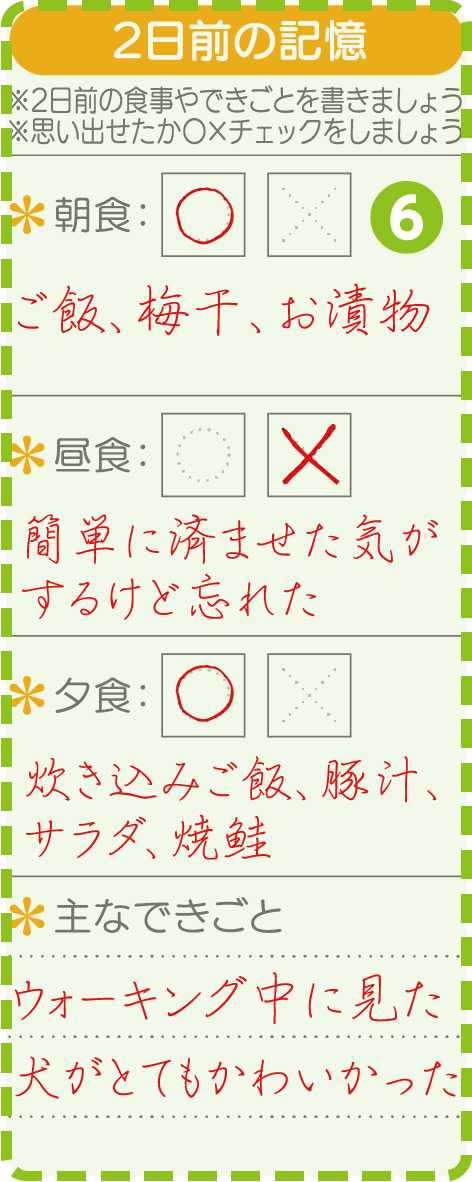 前日に起こったことは覚えていても、2日前となるとあやふやになります。このあやふやな2日前の記憶を呼び戻して手帳に記すことが、加齢とともに衰える「短期記憶」の訓練につながります。