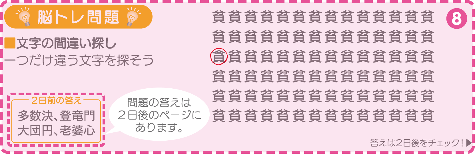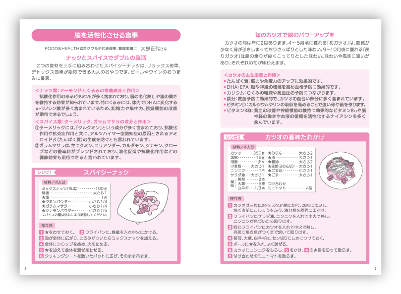 健康長寿手帳は、脳活の面から健康長寿の延伸をサポートするために作りました。日々の予定などを書き込むだけでなく、2日前の出来事を思い出しながら書くコーナーや、日替わりの脳トレ問題をプラスしました。